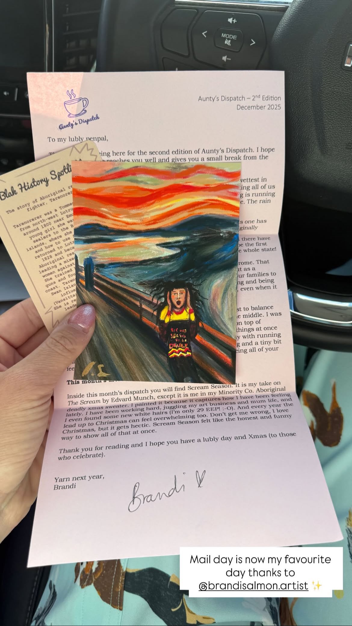 Aunty’s Dispatch is like receiving a yarn from your aunty and a cuppa, a slow, thoughtful moment that arrives right in your letterbox, wherever you are in the world.
